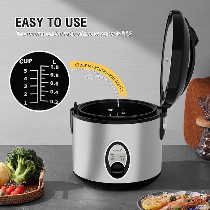 Macook Rice Cooker & Steamer (5 Cups, 1 Litre) for 1-10 People – Stainless Steel, Non-Stick Pot, BPA-Free, Automatic Cooking and Auto Warm Function – High-Temperature Protection Design – 400W