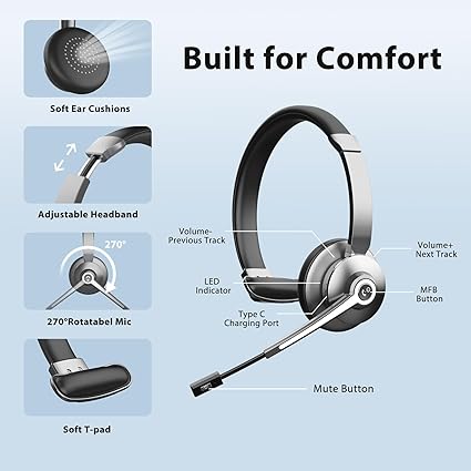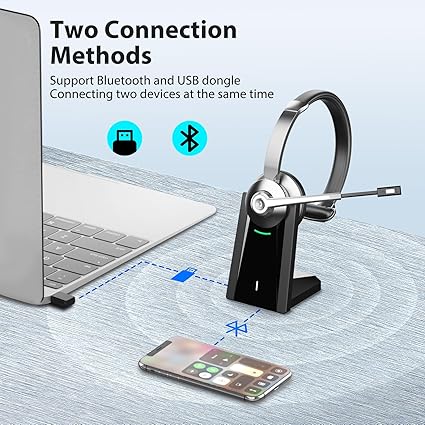 Bluetooth Headphones, Wireless Headset with Microphone Noise Cancelling & USB Dongle, On Ear Headphones with Charging Dock, PC Headset with Mute Button for Cell Phone/Meeting/Call Center/Office. Two Connection Methods (Support Bluetooth and USB dongle connecting two devices at the same time)