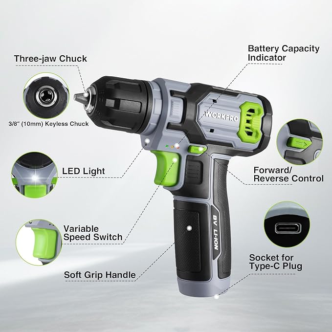 WORKPRO 8V Cordless Drill Set with 53pcs Accessories | Power Electric Drill with 3/8